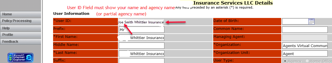 4. Double click on the "User Id" field to highlight all the contents in the field which will include your name and agency name (or partial agency name). Right click on the selection and click 'Copy". Note: if you do not see your name in the User Id field, contact your CRM Representative.