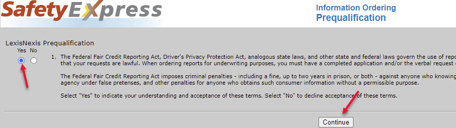 2. Select “Yes” and click the "Continue" button to acknowledge the LexisNexis Prequalification.