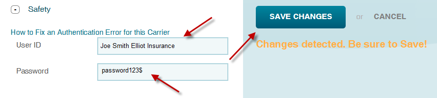 7. Select the “User Id” Field, do a right click with your mouse and select “Paste” so your User Id info appears in that field. Enter the Password- “policy123$” and click “Save Changes”.