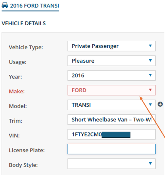 If you ever do an RMV lookup, and after applying it to the quote, the vehicle "Make" looks like the one in the picture below, there is an issue with that VIN and the symbols that go with it.