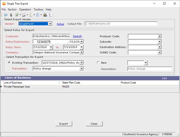 Workflow for exporting a quote from AMS to SinglePoint Rating