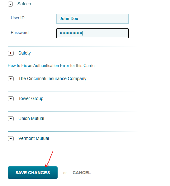 Find the carrier you need to change credentials for, and click the plus sign to expand it. When you are done entering your credentials, click the save button at the bottom to finish.