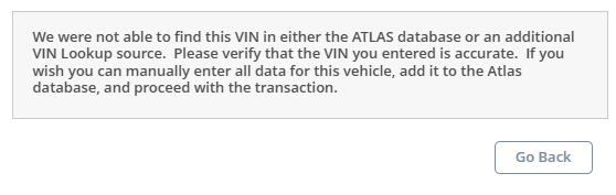 Agent will enter a VIN and select VIN Lookup. A pop up will appear. This message basically says the VIN is NOT in ATLAS (which can happen when it is an Out of state title or Certificate of Origin - most commenly happens on Motorcycles, trailers and campers.)