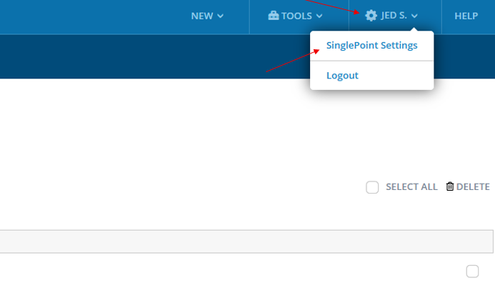 To get to your SP settings, please start by clicking on your name, in the top right of the SPR screen, to the left of the Help menu. Then click on SinglePoint Settings.